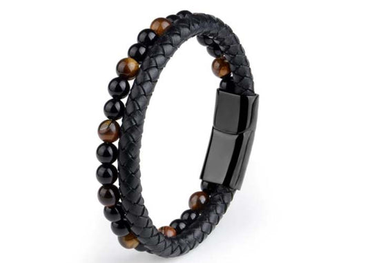 Mens Bracelet Leather Tigers Eye Beads Magnetic Clip (16)